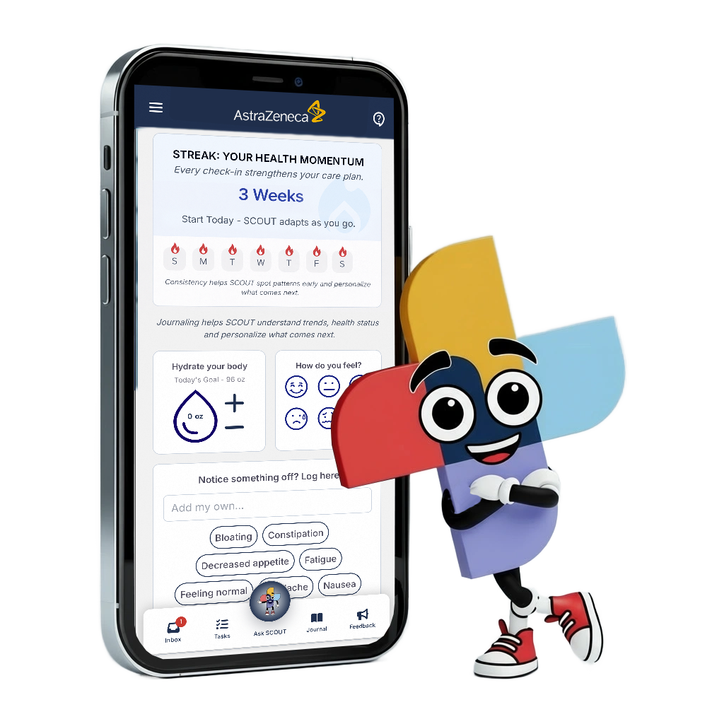 SCOUT is an AI-powered assistant built into the Saphnelo Patient Companion. You can ask it questions about meals, fitness, motivation, budgeting, parenting, travel, home life, daily tasks, and more. It provides you with practical ideas and next steps, so you don’t have to search for answers or figure things out on your own.