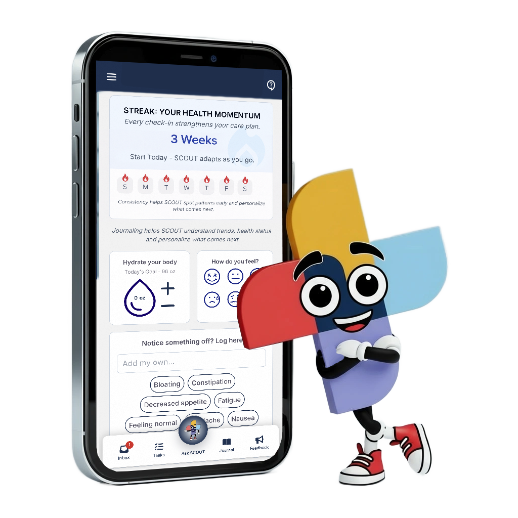 SCOUT is an AI-powered assistant built into the MyWay Patient Companion. You can ask it questions about meals, fitness, motivation, budgeting, parenting, travel, home life, daily tasks, and more. It provides you with practical ideas and next steps, so you don’t have to search for answers or figure things out on your own.
